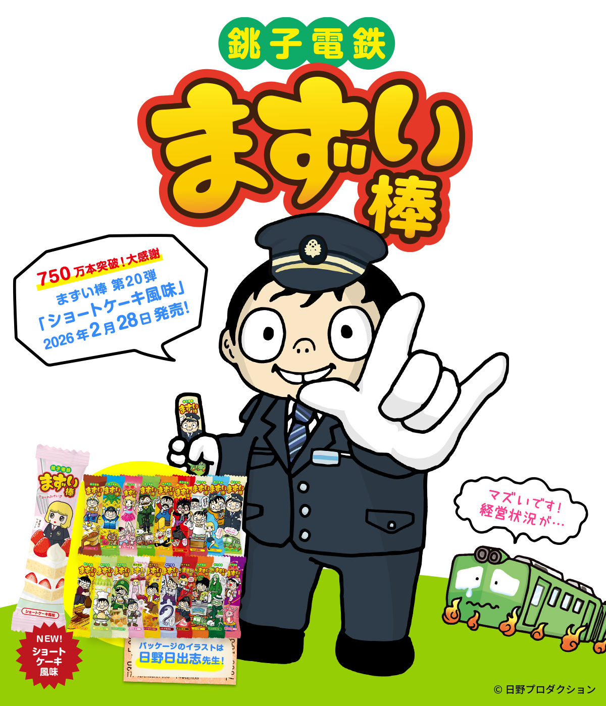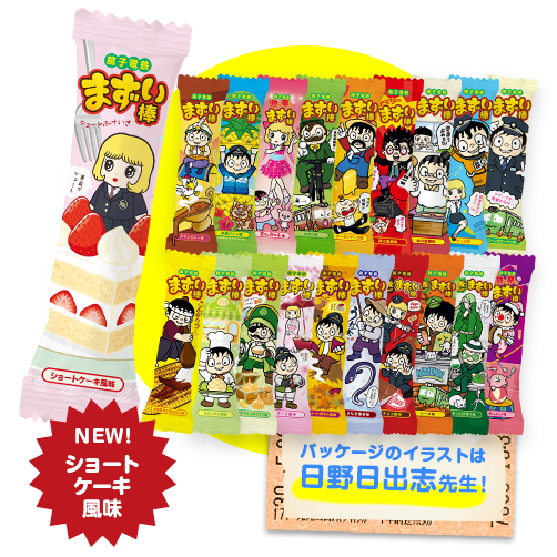 「コーンポタージュ味」「チーズ味」「ぬれ煎餅味」「炭火地鶏味」「か~るいチーズ味」「わさび味」「岩下の新生姜味」「沖縄パイン味」「チキンカレー味」「めんたい味」「あしたば青汁味」「ソース味」「チョコ風味」「うなぎ蒲焼」「スイートポテト風味」「さくら風味」「サワークリームオニオン味」「メロンパン風味」「北海道焼とうもろこし味」と展開し、2月28日にまずい棒 第20弾「ショートケーキ風味」の販売を開始いたしました。